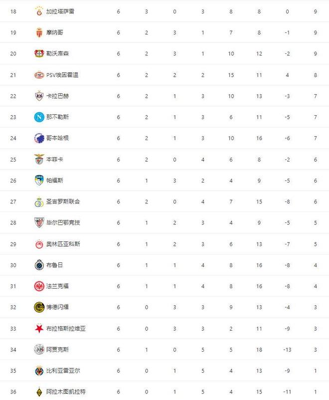 本赛季,比利亚雷亚尔稳居西甲前四,甚至有希望争冠,但到了欧冠赛场沦为送分童子,本轮面对哥本哈根爆出冷门,不仅开场2分钟丢球,还在第90分钟遭到了绝杀,最终2-3失利,开局6轮不胜,仅积1分跌至倒数第二。阿贾克斯VS卡拉巴赫依靠格洛赫的梅开二度,多尔贝格、加埃的联袂破门,阿贾克斯客场4-2逆转卡拉巴赫,结束开局5连败的同时,拿下首场胜利积3分,排名升至第33位,终于摆脱了垫底位置。最新积分榜如下——